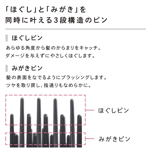●「ほぐし」と「みがき」を 同時に叶える3段構造のピン〈ほぐしピン〉あらゆる角度から髪のからまりをキャッチ。ダメージを与えずにやさしくほぐします。〈みがきピン〉髪の表面をなでるようにブラッシングします。ツヤを取り戻し、指通りもなめらかに。