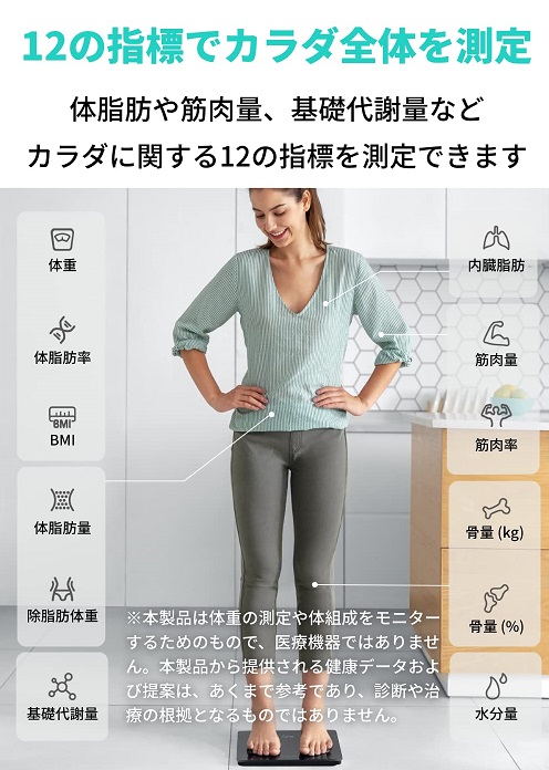 ●12の項目を測定可能:体重や体脂肪率、BMI、筋肉量など、カラダに関する基本的な12の項目が測定可能です。