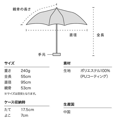 コンパクトで持ち運びしやすいサイズ感ながら、開くと直径95cmの大きめサイズ。 よりしっかりと日差しをガードできるサイズ感です。