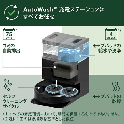 AutoWash 充電ステーションで、ゴミの自動排出、モップパッド洗浄、送風乾燥で、毎日変わらずの効果的な掃除を実現。